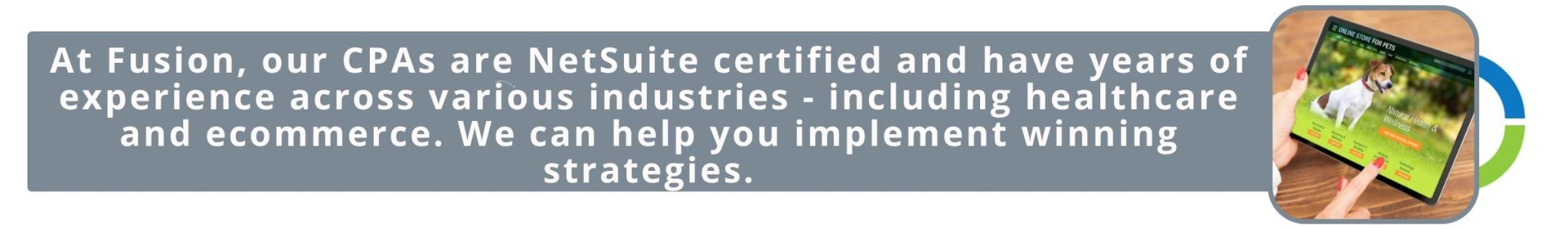 At Fusion, our CPAs are all NetSuite certified and have years of experience across industries – including healthcare and e-commerce. Contact us today.
