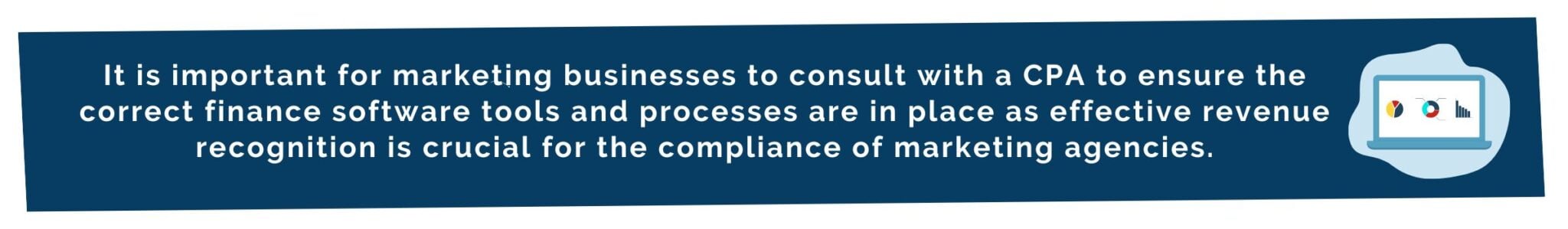 It is essential for marketing businesses to consult with a CPA to ensure the correct finance software tools and processes are in place as effective revenue recognition is crucial for the financial transparency and compliance of marketing agencies.