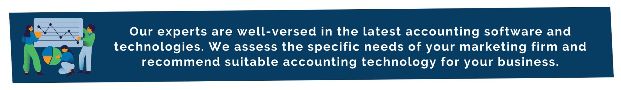 Our experts are well-versed in the latest accounting software and technologies. We assess the specific needs of your marketing firm and recommend suitable accounting technology for your business.
