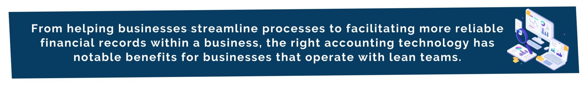 From helping businesses streamline processes to facilitating more reliable financial records within a business, the right accounting technology has notable benefits for businesses that operate with lean teams. We take a look at some of the key advantages.