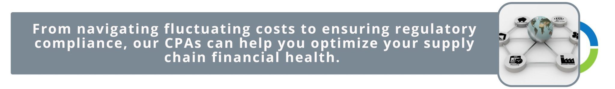 Because there’s a lot to consider in this field, it is important to align with specialized expertise. Our Supply Chain CPAs have a knack for implementing controls when it comes to fluctuating figures and differing laws. We interpret financial data with a keen eye for efficiency and cost savings.