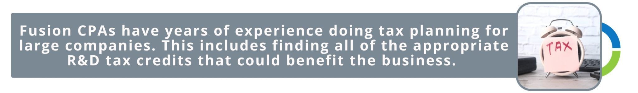 At Fusion, our CPAs have years of experience doing tax planning for large companies. This includes finding all of the appropriate R&D tax credits that could benefit the business. We have worked with companies from many different industries and understand the different strategies needed for the best tax planning. For personalized assistance and to explore how your company can benefit from these credits, contact us today!