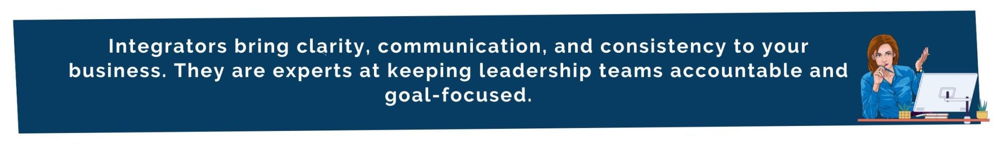 So, what is an integrator? Essentially, they’re the visionary’s right-hand person or their number two. They’re responsible for harmoniously uniting critical functions of a business and creating focus, accountability, and alignment. I like to think of us as skilled executive project managers who run and manage the various tasks within a business to free owners up to work on the growth strategy of the business.