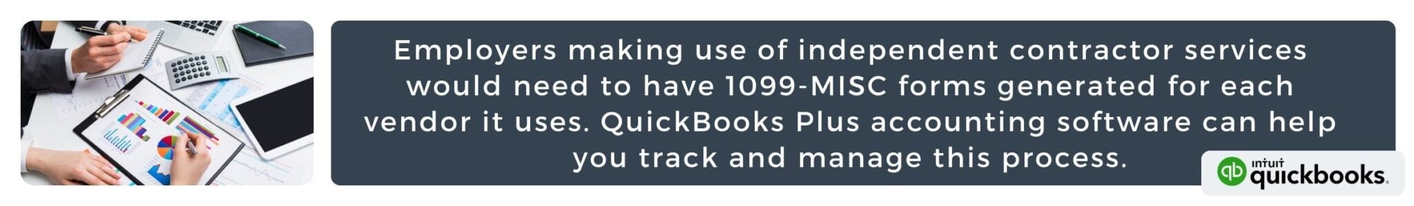 - Use your records to create and populate 1099 MISC forms for each independent contractor affiliated with your business over the course of the year to report the total amount you paid each contractor during the year. This can be done easily within the QuickBooks Plus software, where you can create and file 1099s with QuickBooks Contractor Payments.