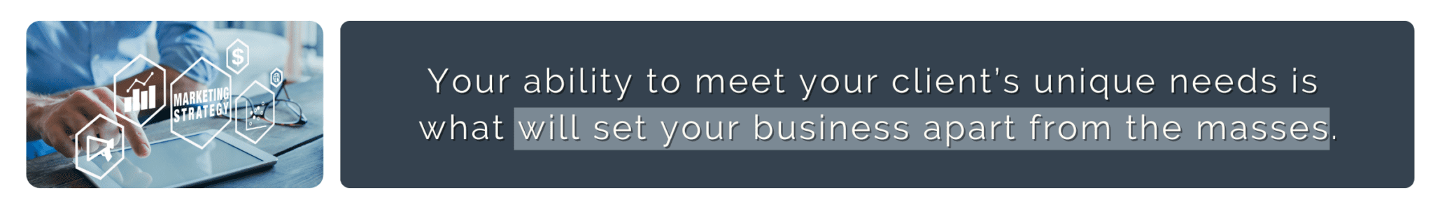Identifying your customer’s problems is a must in every niche market strategy example. Your niche market plan succeeds if you know what your clients need and if other companies in the industry are meeting those needs. Your ability to meet your client’s unique needs is what will set your business apart from the masses.